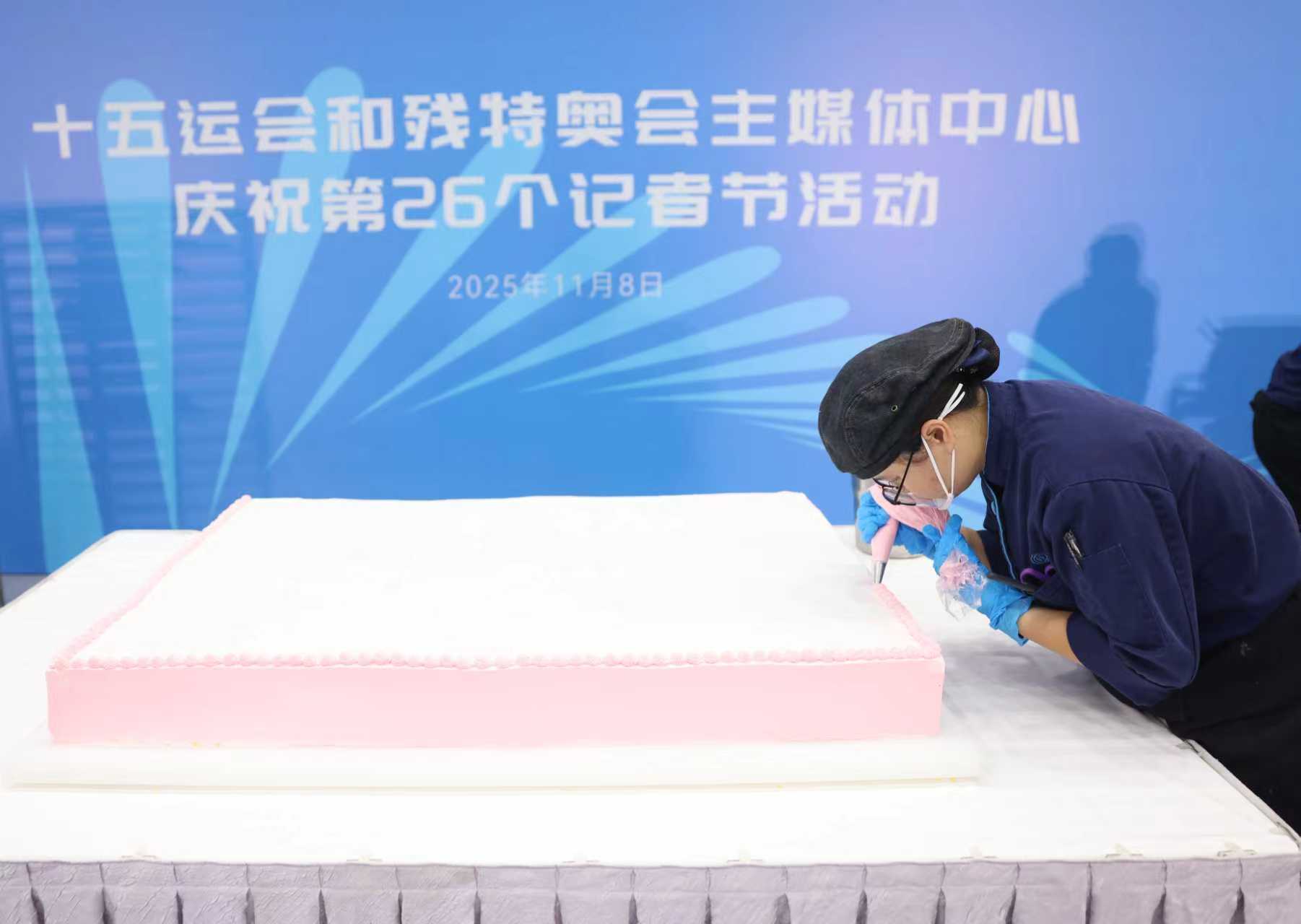 活动现场,一个特制的主题蛋糕,引起了记者们的关注。据介绍,这块蛋糕长1.1米、宽0.8米,代表着11月8日这个特别的节日,蛋糕上装饰了相机、话筒、笔记本等图案,表达对记者的敬意和祝福。同时,蛋糕上还放了十五运会和残特奥会吉祥物——喜洋洋和乐融融,营造迎接十五运会和残特奥会的浓厚氛围。