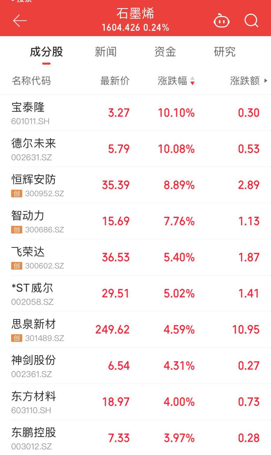 10月10日,石墨烯概念逆市活跃,宝泰隆、德尔未来涨停,恒辉安防、飞荣达、东方材料等跟涨。消息面上,商务部、海关总署发布公告,公布对锂电池和人造石墨负极材料相关物项实施出口管制的决定。