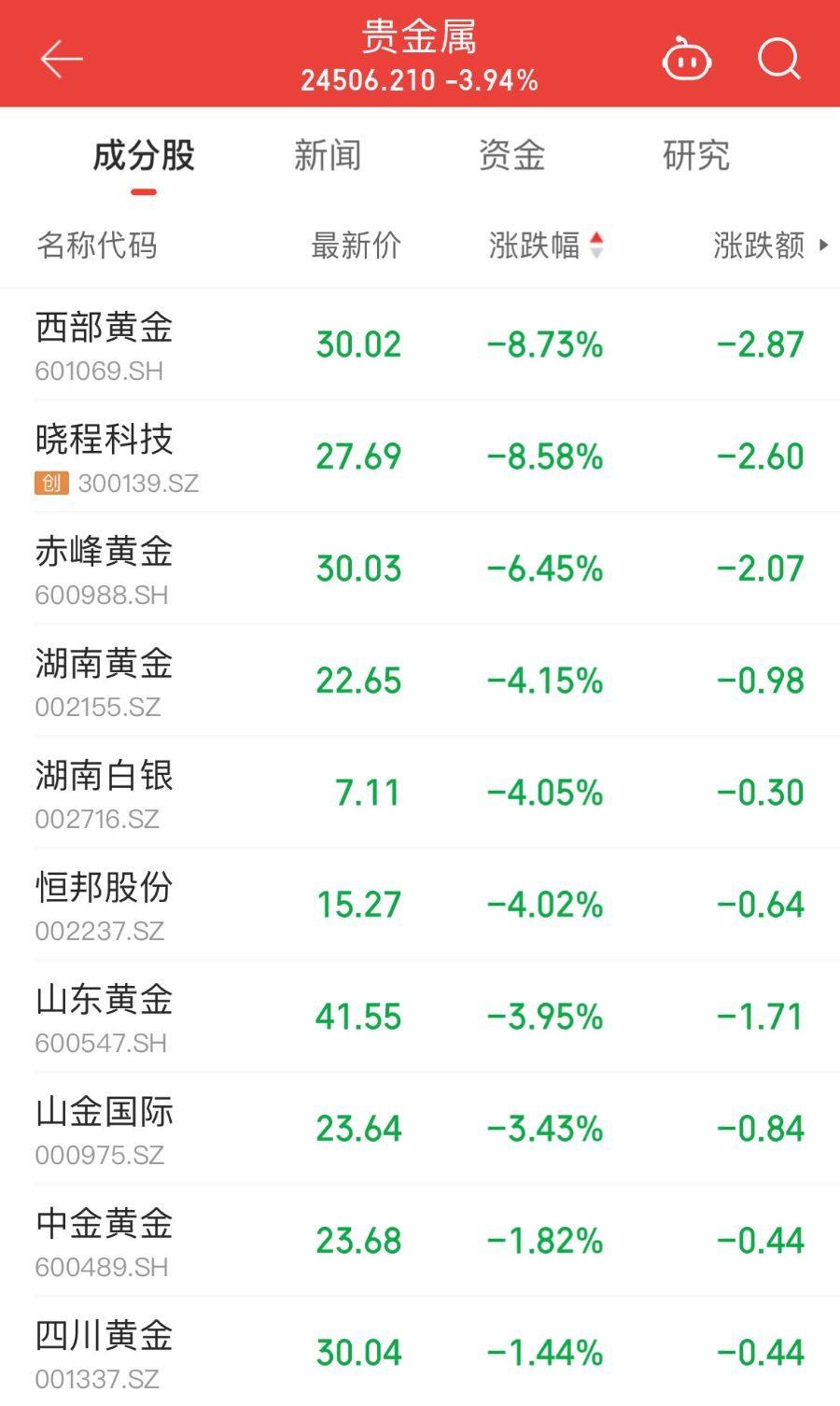 贵金属大面积回调,西部黄金、晓程科技跌超8%,赤峰黄金、盛达资源跌5%,紫金矿业跌超3%。