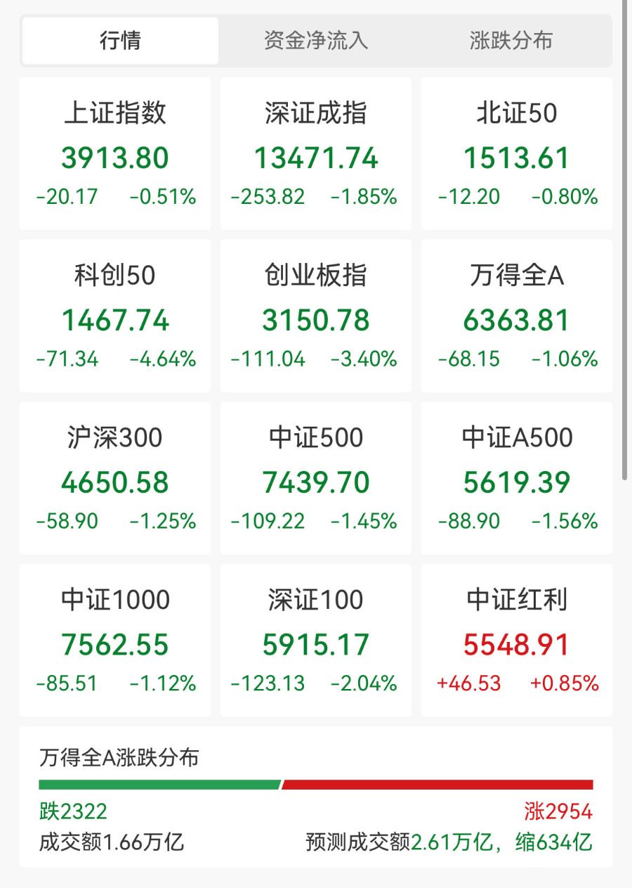 10月10日,三大指数集体低开,截至午盘,上证指数跌0.51%,深证成指跌1.85%,创业板指跌3.4%。市场超2300家个股下跌,成交额1.66万亿,预计成交额上一交易日同期缩量634亿元。