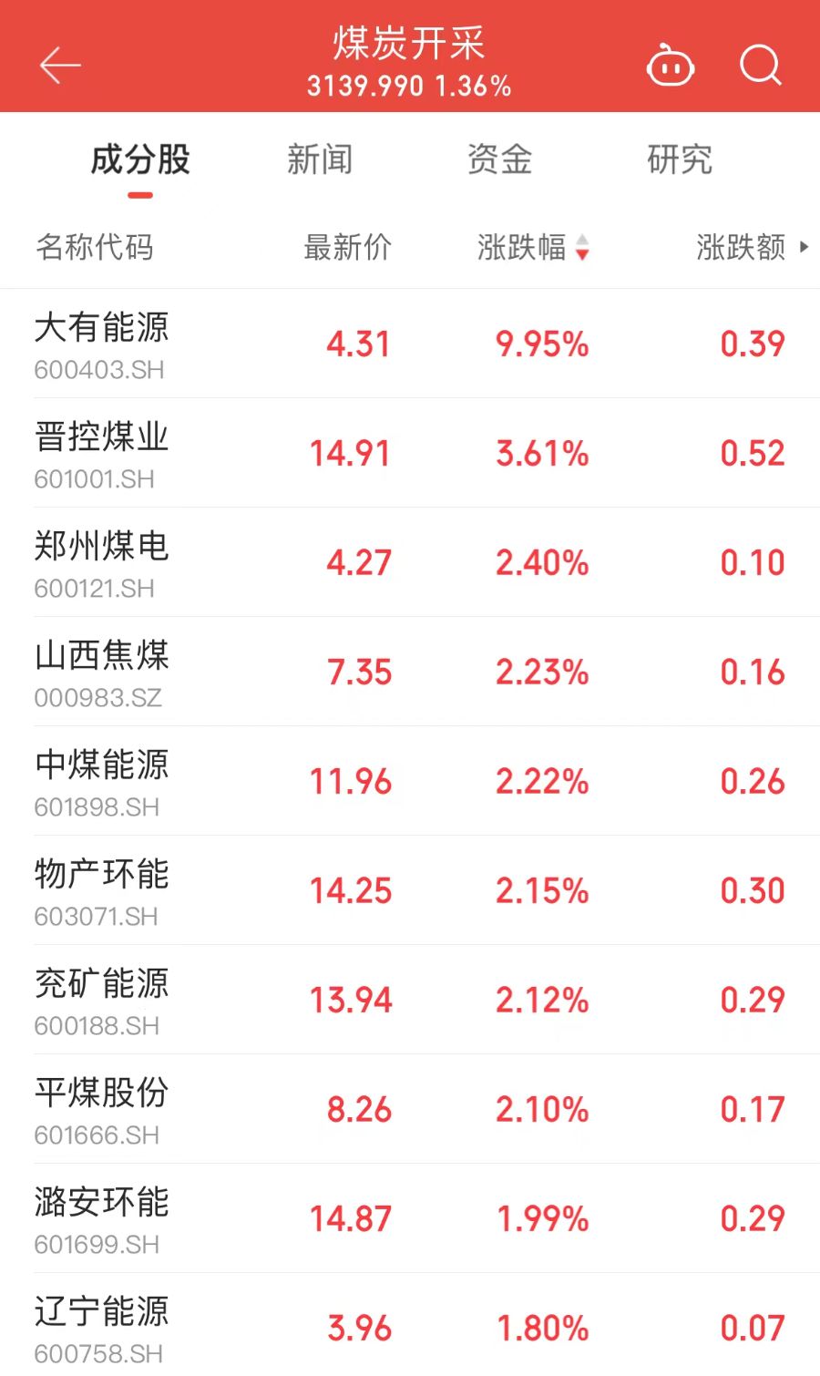 煤炭开采加工板块震荡上扬,大有能源涨停,晋控煤业、山西焦煤、郑州煤电、潞安环能跟涨。